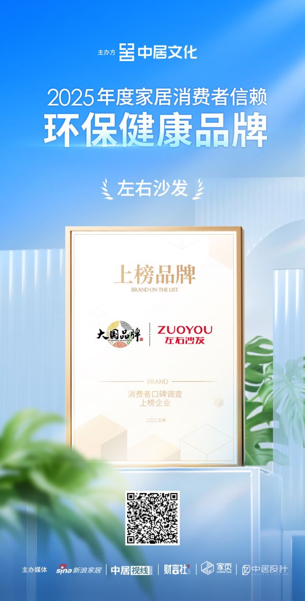 在本次评选中,左右沙发凭借优越的产品质量、良好的消费者口碑,获得消费者和行业的高度认可,从上百家家居品牌脱颖而出,荣膺“2025年度家居消费者信赖质量标杆品牌”、“2025年度家居消费者信赖环保健康品牌”称号。