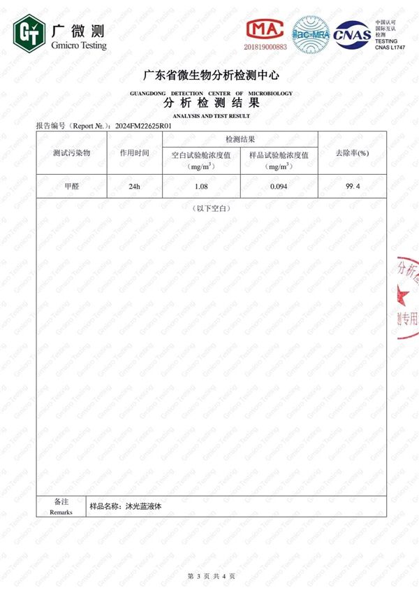 沐光蓝是一种高纯度的活性生物酶制剂,无需光照或其他外部条件即可直接分解污染源,实现从源头去除甲醛。经权威检测,其甲醛去除率高达99.1%,是业内口碑卓越的一款除甲醛喷雾,并拥有长达15年的线下实践验证,是一款非常成熟稳定的产品。