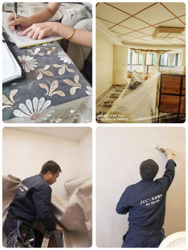 天洋墙布不用调胶、刷胶,师傅带工具上门,直接加热熨贴,没粉尘也没异味;