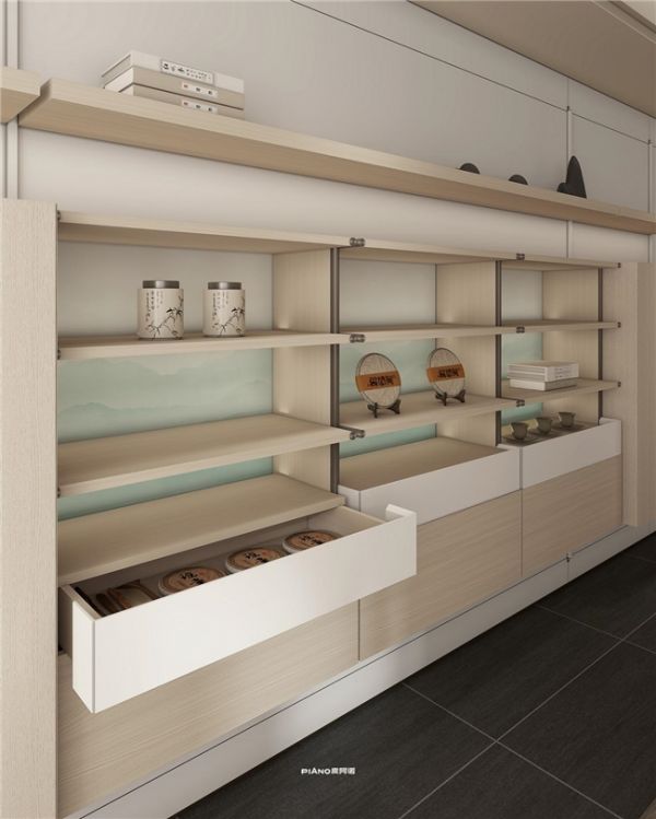 典藏室是承载家庭记忆与文化底蕴的专属空间,对柜体的稳固性与质感有着极高要求。皮阿诺协奏・梦华系列典藏室柜体采用榫卯工艺打造核心结构,精准的凹凸咬合让柜体历经岁月仍能保持坚实,妥善守护名画、古籍等珍贵藏品。深色榆木的应用为空间注入沉稳气息,搭配天青白石英石台面,其丰富的纹理宛如淡雅山水画卷,让藏品在兼具保护功能的柜体中,更显文化价值。榫卯工艺的千年传承与典藏物品的时光印记相互呼应,让空间成为连接过去与当下的文化载体。
