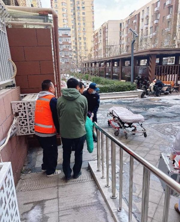 靳学玲记得王大妈之前曾提到过自己患有高血压,还安装过心脏支架。于是她立刻叫上商圈经理燕玲,火速赶往老人家中。在门口等候了几分钟后,老人才缓缓打开房门,只见老人面色苍白、浑身无力,精神状态十分萎靡。“等120来了,我们陪您一起去医院,您别担心。”靳学玲和燕玲一边安慰王大妈,一边帮着收拾相关证件准备出发。考虑到老小区楼梯狭窄,两人又联系了店内男同事杨增铭、韩国利前来帮忙。不久,120救护人员赶到,大家一起把王大妈抬下楼送上救护车,前往附近的医院进行治疗。