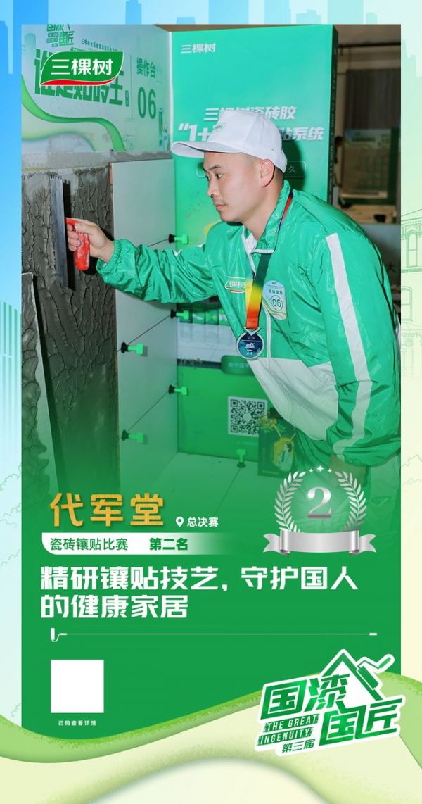 2025三棵树“国漆国匠”大赛总决赛瓷砖镶贴亚军代军堂:精研镶贴技艺,守护国人的健康家居