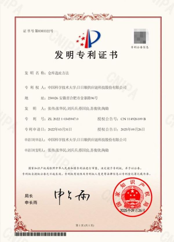 近日,据国家知识产权局公告显示,由日日顺供应链与中国科学技术大学创客团队共创的“仓库选址方法”,正式被授予国家发明专利权。据悉,日日顺创客训练营截至目前累计申请的国家专利已达到145项,是物流行业拥有专利最多的产学研结合平台。