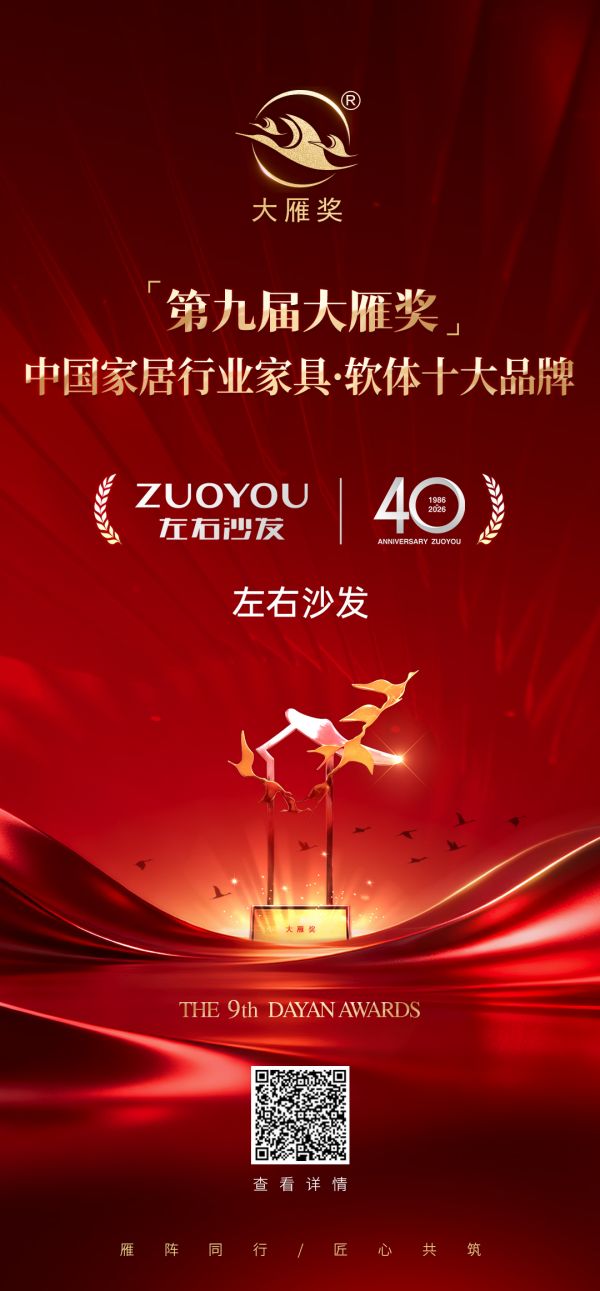 1月30日,「第九届大雁奖」获奖名单于云端发布会正式揭晓。左右沙发凭借其在家具领域的卓越产品力、领先的品牌影响力与持续的市场引领表现,荣获“第九届大雁奖·中国家居行业家具·软体十大品牌”这一细分领域的权威殊荣。