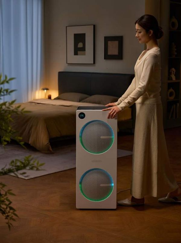 常规空气净化器就像是个傻柱子,突兀的出现在客厅、卧室等空间。此外,市面上的空气净化器外观普遍同质化:白色机身、立式四方棱柱,每次看到都会有种审美疲劳的感觉。