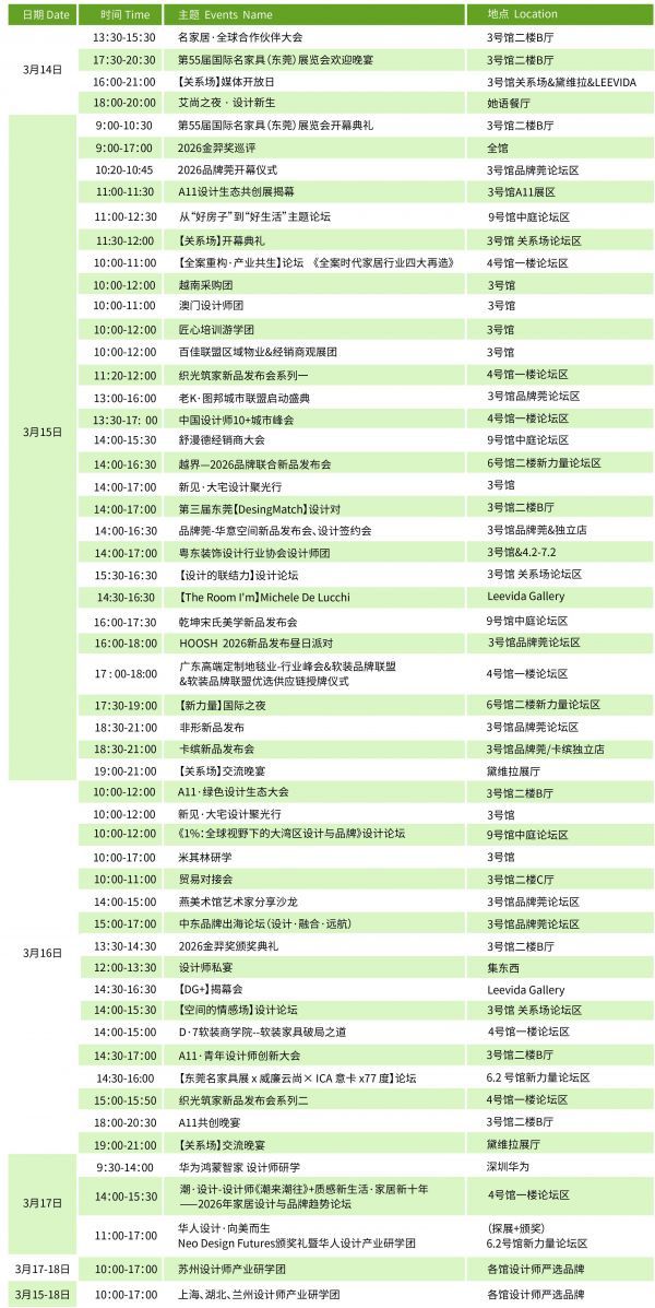 展会不仅是产品的秀场,更是思想的策源地。六天五夜,循光同行·全球合作伙伴大会、第55届国际名家具(东莞)展览会欢迎晚宴暨金羿十年盛典、开幕式三场重磅活动,一项行业大奖锚定产业航向,以及从“好房子”到“好生活”主题论坛、《1%:全球视野下的大湾区设计与品牌》设计论坛、老K·图帮城市联盟启动盛典、新见·大宅设计聚光行、华人设计·向美而生Neo Design Futures颁奖礼暨华人设计产业研学团,更有品牌开业等200+场同期活动则让这场盛会真正“活”起来——思想的密度、交锋的烈度、链接的深度,每一天都在这里发生化学反应。