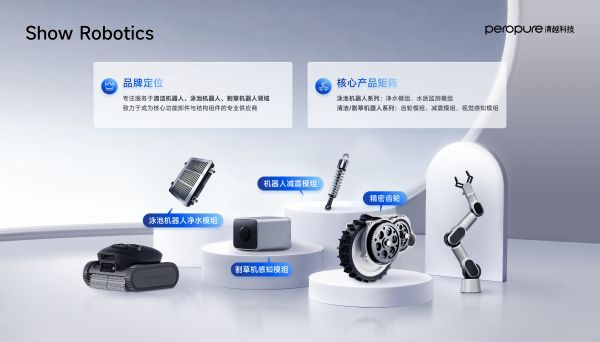 在配盾品牌升级之后,PeroPure清越科技正式发布全新品牌——Show Robotics。该品牌作为PeroPure清越科技面向服务机器人打造的核心部件品牌,聚焦三大高成长赛道:扫地机器人、泳池机器人、割草机器人,专注提供高壁垒核心功能组件。