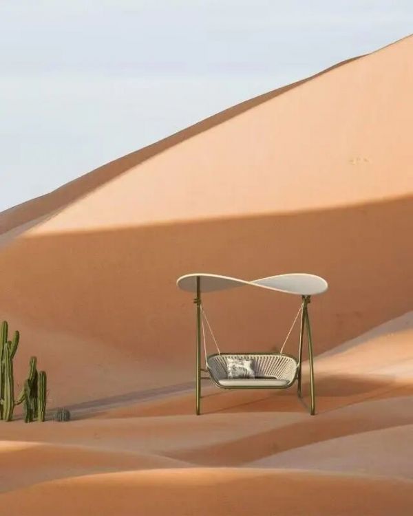 从视觉视角来看,这款秋千的线条设计极具巧思,站在正侧方看,它是完整的无限符号,换个角度,又能看到流畅的弧线美感;秋千的侧面支柱设计灵感来源于沙漠中的仙人柱,采用不对称的高低造型,呈现出富有张力的视觉效果,正面和侧面看都极具设计感,也和“Oasis绿洲”的主题相呼应。
