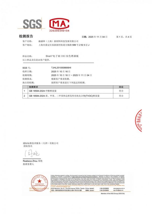 经权威机构检测,中同爱邦-Skeli®电子束(EB)实色烤漆板甲醛释放量仅0.007mg/m²,苯、甲苯、二甲苯均未检出,TVOC释放量低至0.067mg/m²,所有指标均符合并远超GB18584-2024新国标,达到母婴级环保标准,消除装修污染隐患。
