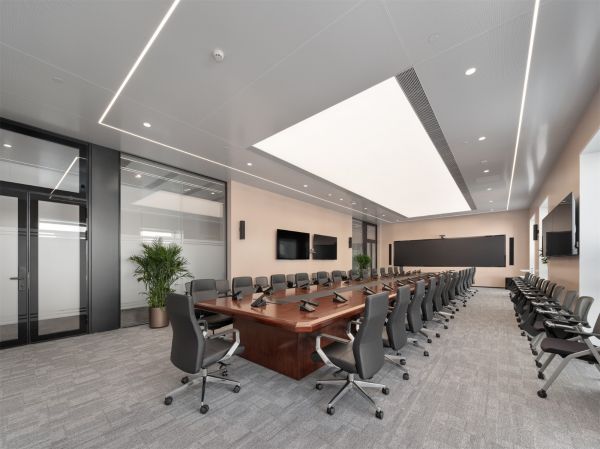会议室延续简约和理性的风格。玉之华会议桌寓意“玉契天成,御临天下”,汲取故宫宝座的造型元素,演绎领导者冷静从容与运筹帷幄,箱体内部可隐藏式走线,令桌面干净整洁。
