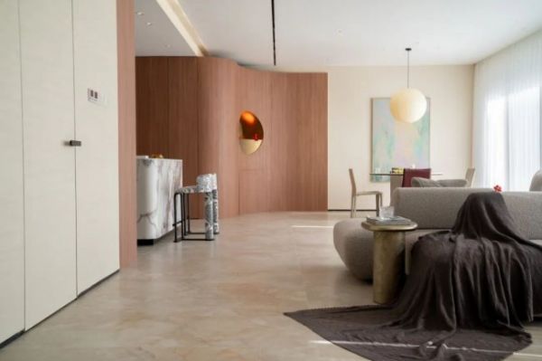 无论是光脚踩在地面肆意踱步,还是随性席地而坐享受独处时光,都能感受到源于旷野的温柔包裹,让日常琐碎都化作度假般的松弛惬意。连贯的砖面纹理让整个公区浑然一体,既包容着家人之间的亲密互动,也能安放独处时的宁静沉思。