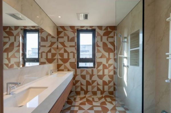 卫生间则以1492・石语系列-迷宫瓷砖,打破了传统卫浴空间的沉闷。野麦黄与焦糖棕交织的几何纹样,如迷宫般层次迭起,不仅为空间注入了灵动活泼的气息,更通过纹理的延伸巧妙拓展了空间纵深感,让日常沐浴洗漱,都能跳脱庸常琐碎,化作一场兼具趣味与美感的感官盛宴。