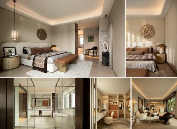 主卧设计,亦跳出尊崇与私密的单一框架,走向场景化与差异化。余姚臻园以洄游动线整合休息、更衣、办公等全场景功能,精准回应现代人对效率与仪式感的双重追求;杭州溪径恒庐则以软装为媒介,让空间自带“度假感”;温岭湖畔恒庐更将水吧与起居区融入主卧,早起泡茶、睡前翻书,让主卧成为兼具实用性与仪式感的私属天地。
