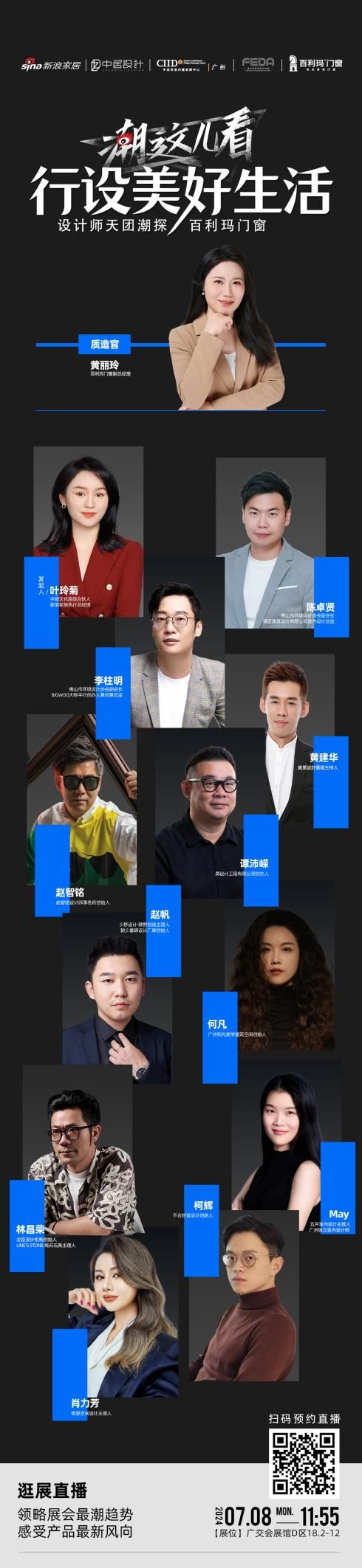 据悉此次设计师天团由佛山市环境设计构协会副会长、博亚建筑设计有限公司室内设计总监陈卓贤,佛山市环境设计协会副会长、BIGWOO大物平行创办人兼创意总监李柱明、黄巢設計團隊主持人黄建华,赵智铭设计师事务所创始人赵智铭,昊设计工程有限公司创办人谭沛嵘,彡野设计·肆野创造主理人、朝彡暮肆设计厂牌创始人赵帆,广州和光美学建筑空间创始人何凡,左臣设计机构创始人、LINE’S STONE 线石石具主理人林昌荣,不合时宜设计创始人柯辉,五月室内设计主理人、广州独立室内设计师May,维恩空间设计主理人肖力芳等超十位设计师组成。同时,百利玛门窗副总经理黄丽玲将与设计师天团共话门窗行业发展新趋势、共享新发展。